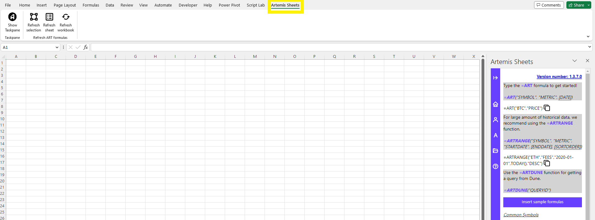 - You’re ready to get started with your first =ART() formula! See syntax-and-formulas for sample formulas or click “Insert sample formulas” to write your first formula.