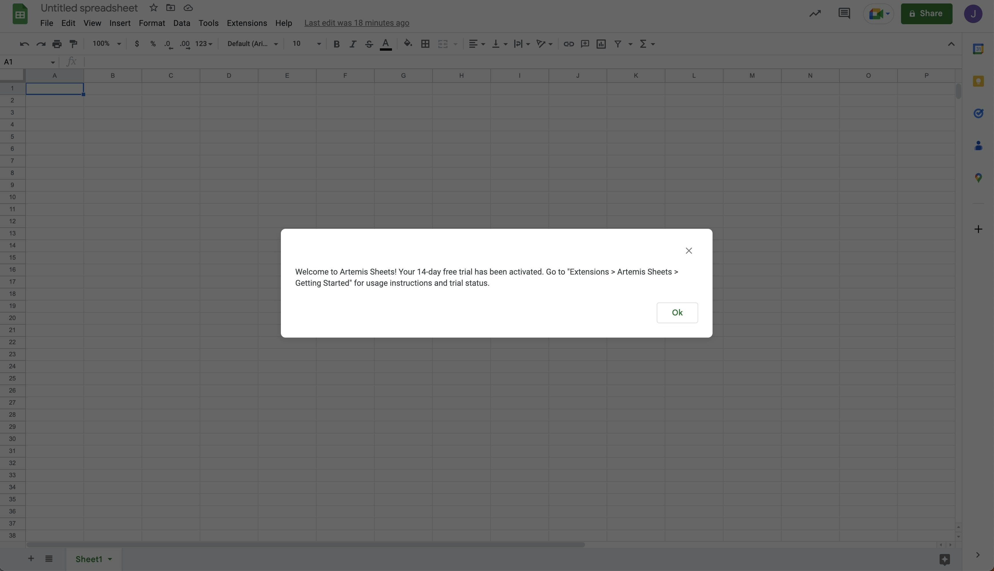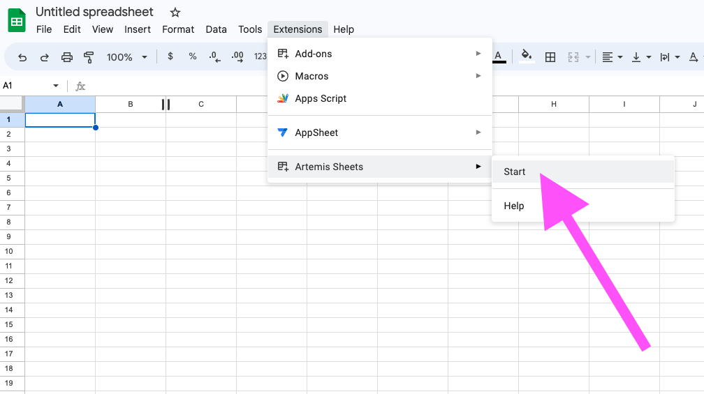 - Start the plug-in by navigating to Extensions -> Artemis Sheets -> Start\